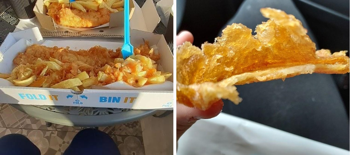 Small fish & chips perfectly good. Tasted spot on even my dad made a good comment and he’s hard to please. Scraps large pieces not floated in grease Curry sauce as tasted and not too hot or spicy. Will defo visit again